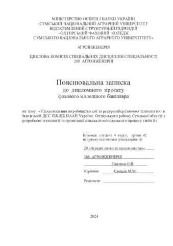 Гапонов, О.В. and Свищов, М.М. (2024) Удосконалення виробництва сої за ресурсозберігаючою технологією в Іванівській ДСС ІБКіЦБ НААН України Охтирського району Сумської області з розробкою технології та організації сільськогосподарського процесу сівби її. Diploma thesis, Охтирський фаховий коледж.