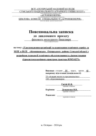 Гнітій, Ю. В. and Домашенко, В.В. (2024) Удосконалення організації та планування технічного сервісу за МТП в ПСП «Комишанське» Охтирського району Сумської області з розробкою технології технічного обслуговування та діагностування гідросистеми начіпного пристрою трактора ЮМЗ-8271. Diploma thesis, Охтирський фаховий коледж.