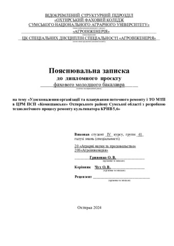 Гриненко, О. В. and Чут, О.В. (2024) Удосконалення організації та планування поточного ремонту і ТО МТП в ЦРМ ПСП «Комишанське» Охтирського району Сумської області з розробкою технологічного процесу ремонту культиватора КРНВ 5,6. Diploma thesis, Охтирський фаховий коледж.