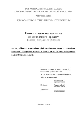 Демидко, М.А. and Дараган, В.М. (2024) Проект технологічної лінії виробництва творогу з розробкою технології пастеризації молока в умовах ПСП «Надія» Охтирського району Сумської області. Diploma thesis, Охтирський фаховий коледж.