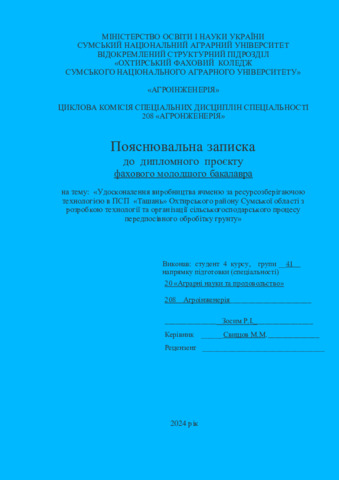 Зосим, Р. І. and Свищов, М.М. (2024) Удосконалення виробництва ячменю за ресурсозберігаючою технологією в ПСП «Ташань» Охтирського району Сумської області з розробкою технології та організації сільськогосподарського процесу передпосівного обробітку грунту. Diploma thesis, Охтирський фаховий коледж.