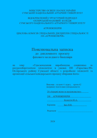 Колкутін, Ю. А. and Івах, В. В. (2024) Удосконалення виробництва соняшника за ресурсозберігаючою технологією в умовах ПП «Тарасівка-99» Охтирського району Сумської області з розробкою технології та організації сільськогосподарського процесу збирання його. Diploma thesis, Охтирський фаховий коледж.