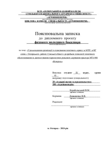 Корабельський, В.М. and Домашенко, В.В. (2024) Удосконалення організації та планування технічного сервісу за МТП в ФГ «Апіс» Охтирського району Сумської області з розробкою технології технічного обслуговування та діагностування гідросистеми рульового керування трактора МТЗ-900 «Білорусь». Diploma thesis, Охтирський фаховий коледж.