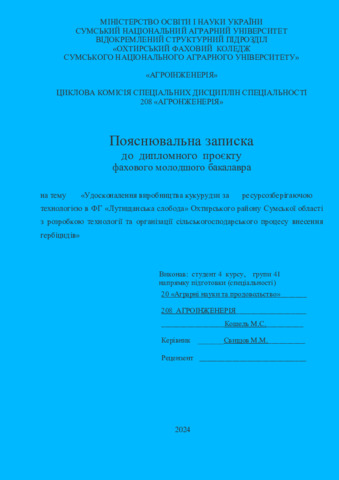 Кошель, М. С. and Свищов, М.М. (2024) Удосконалення виробництва кукурудзи за ресурсозберігаючою технологією в ФГ «Лутищанська слобода» Охтирського району Сумської області з розробкою технології та організації сільськогосподарського процесу внесення гербіциді. Diploma thesis, Охтирський фаховий коледж.