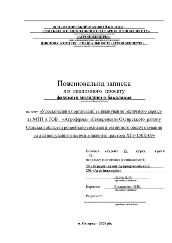 Ладур, Д. О. and Домашенко, В.В. (2024) Удосконалення організації та планування технічного сервісу за МТП в ТОВ «Агрофірма» «Семереньки» Охтирського району Сумської області з розробкою технології технічного обслуговування та діагностування системи живлення трактора ХТЗ-150Д-09. Diploma thesis, Охтирський фаховий коледж.