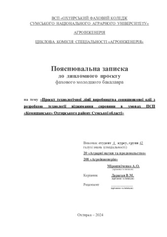 Мірошніченко, А. О. and Дараган, В.М. (2024) Проект технологічної лінії виробництва соняшникової олії з розробкою технології віджимання сировини в умовах ПСП «Комишанське» Охтирського району Сумської області. Masters thesis, Охтирський фаховий коледж.