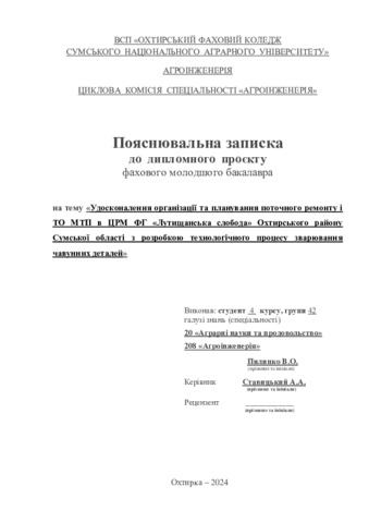 Пилипко, В. О. and Ставицький, А.А. (2024) Удосконалення організації та планування поточного ремонту і ТО МТП в ЦРМ ФГ «Лутищанська слобода» Охтирського району Сумської області з розробкою технологічного процесу зварювання чавунних деталей. Diploma thesis, Охтирський фаховий коледж.
