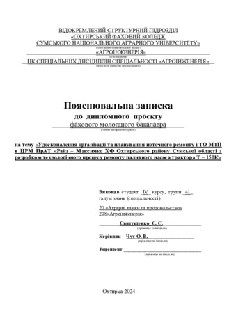 Святушенко, Є. Є. and Чут, О.В. (2024) Удосконалення організації та планування поточного ремонту і ТО МТП в ЦРМ ПрАТ «Райз – Максимко ХФ Охтирського району Сумської області з розробкою технологічного процесу ремонту паливного насоса трактора Т – 150К. Diploma thesis, Охтирський фаховий коледж.