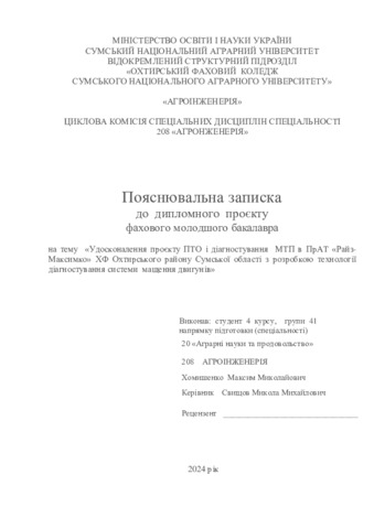 Хомишенко, М. М. and Свищов, М.М. (2024) Удосконалення проєкту ПТО і діагностування МТП в ПрАТ «Райз- Максимко» ХФ Охтирського району Сумської області з розробкою технології діагностування системи мащення двигунів. Diploma thesis, Охтирський фаховий коледж.