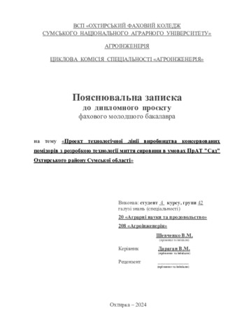 Шевченко, В. М. and Дараган, В.М. (2024) Проект технологічної лінії виробництва консервованих помідорів з розробкою технології миття сировини в умовах ПрАТ "Сад" Охтирського району Сумської області. Diploma thesis, Охтирський фаховий коледж.