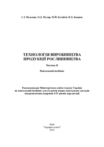 Мельник, С.І. and Муляр, О.Д. and Кочубей, М.Й. and Іванцов, П.Д. (2010) Технологія виробництва продукції рослинництва. Частина друга. Аграрна освіта.