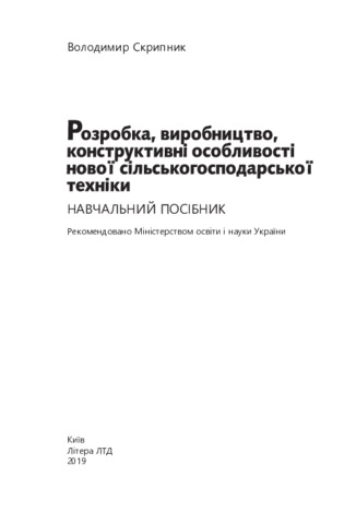Скрипник, В.І. (2019) Розробка, виробництво, конструктивні особливості нової сільськогосподарської техніки. Літера ЛТД.
