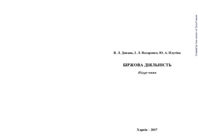 Дикань, В. Л. and Назаренко, І. Л. and Плугіна, Ю. А. (2017) Біржова діяльність: Підручник. УкрДУЗТ, Харків.